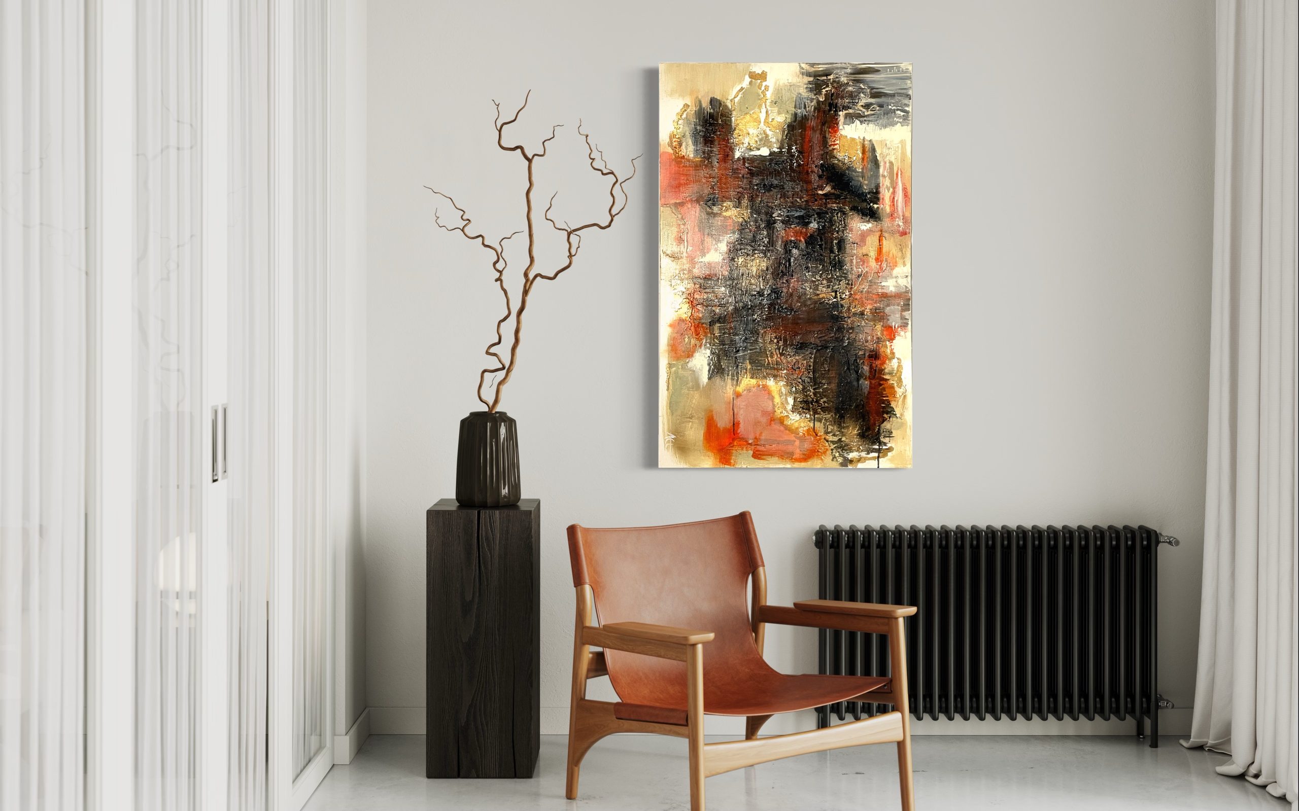 Description: This multidimensional, textured canvas showcases layers of beige, white, black, orange, and 24k gold leaf interwoven among peaks and crevices with small splashes of olive green peaking through in various places. Zoom in for the full effect!