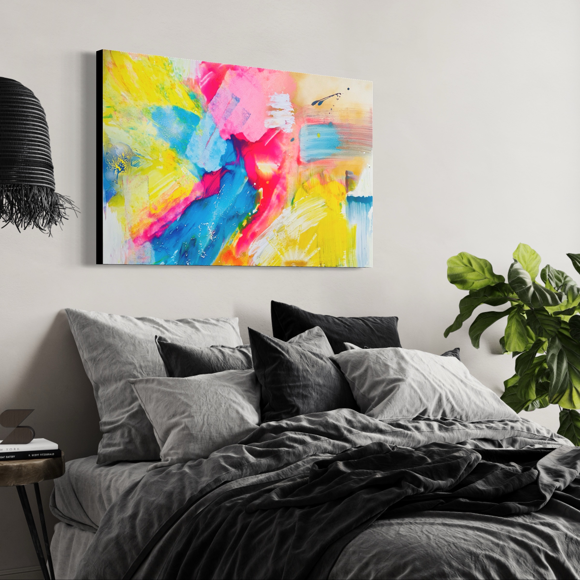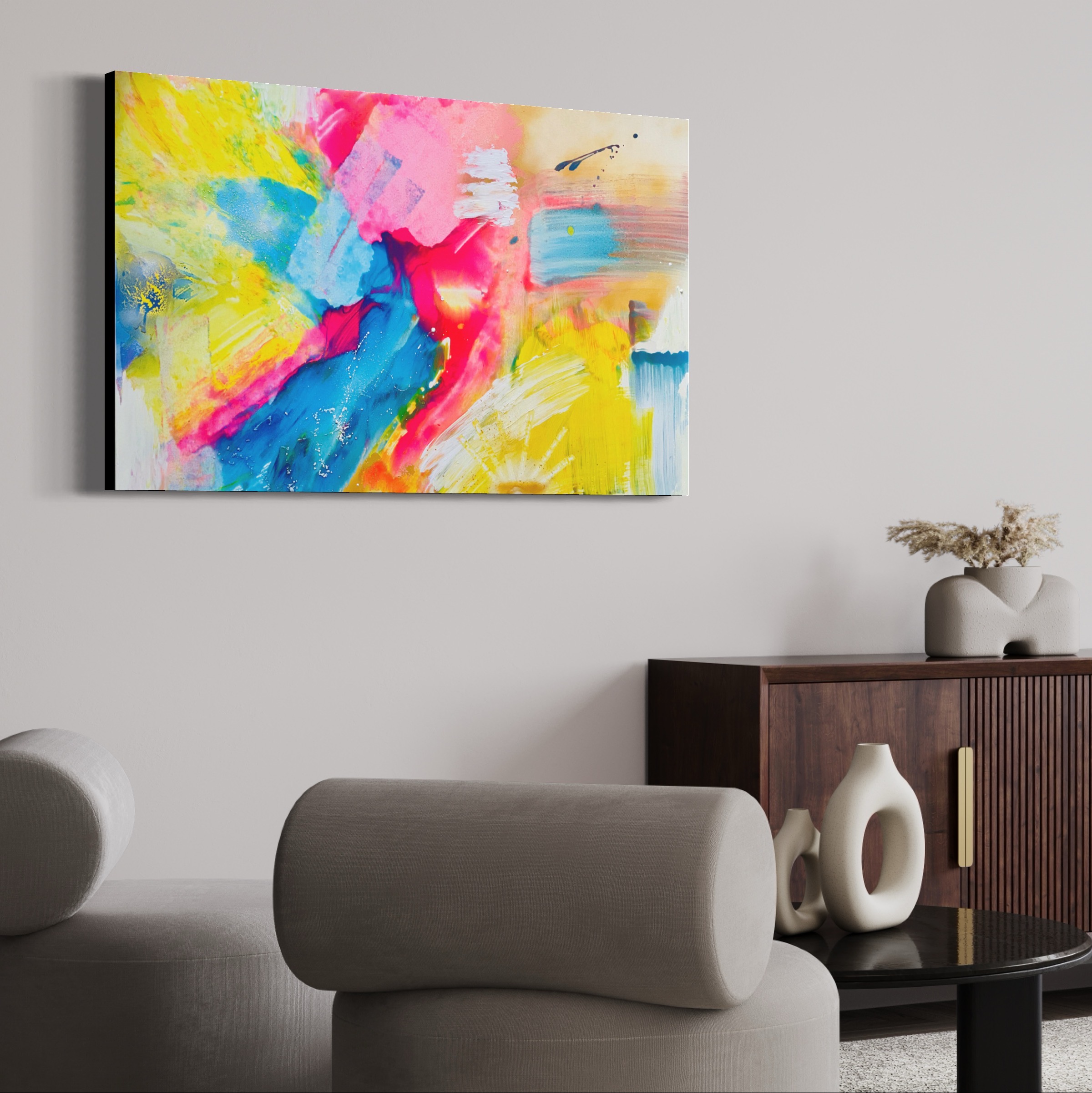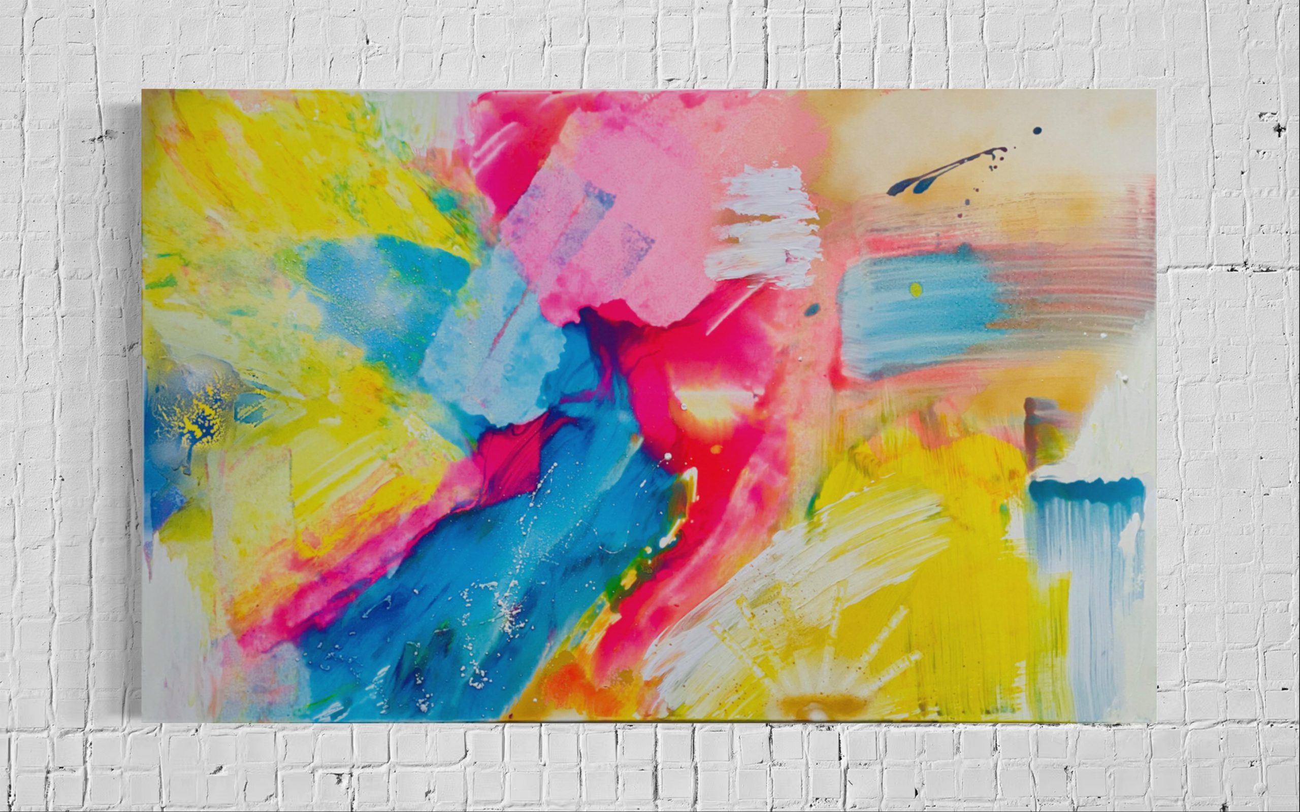 Textured strokes of yellow, pink, and blue dominate the background while splashes of translucent blue and pink command the foreground. Colors pool together in some areas while sitting one on top of another in other parts. Stressing the need to take a deeper look.
