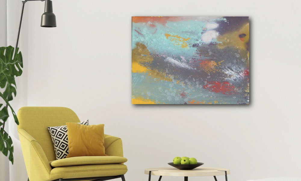 Description: Turquoise, deep purple and gold radiate a sense of clarity, promoting open communication, prosperity and abundance. Textured droplets of white sit on the surface, splashes of red and orange create ripples of rejuvenation and new beginnings.